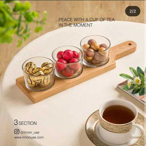 Elegant snack and serving set with clear glass trays and a premium wooden base Available...