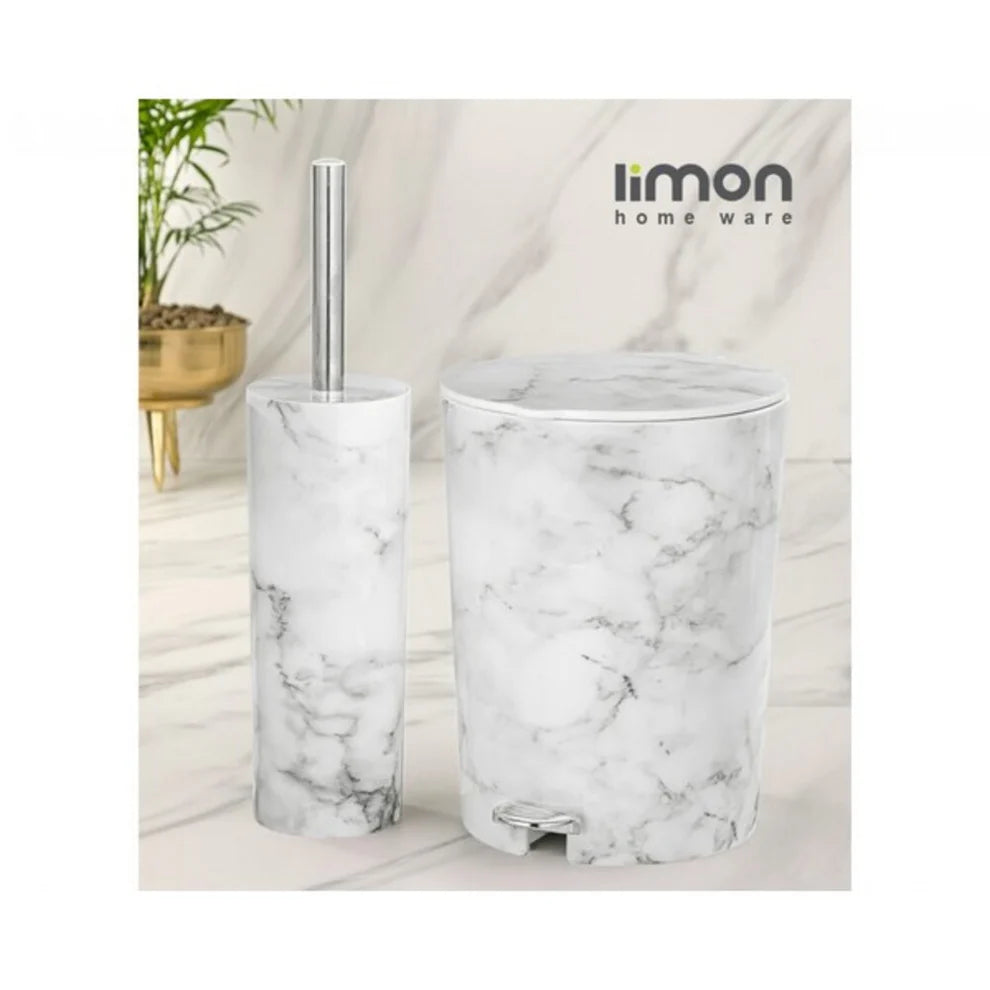 Complete 6-piece set including flip-lid dustbin (5.5L), soap dish, toothbrush holder, liquid soap dispenser, brush with holder & tissue roll holder