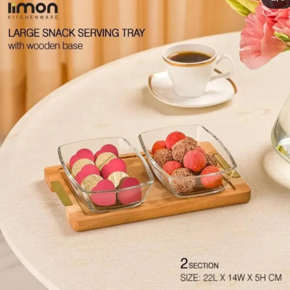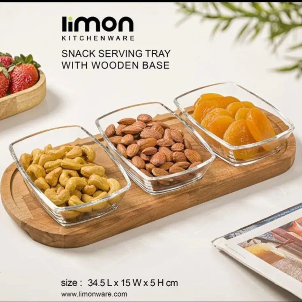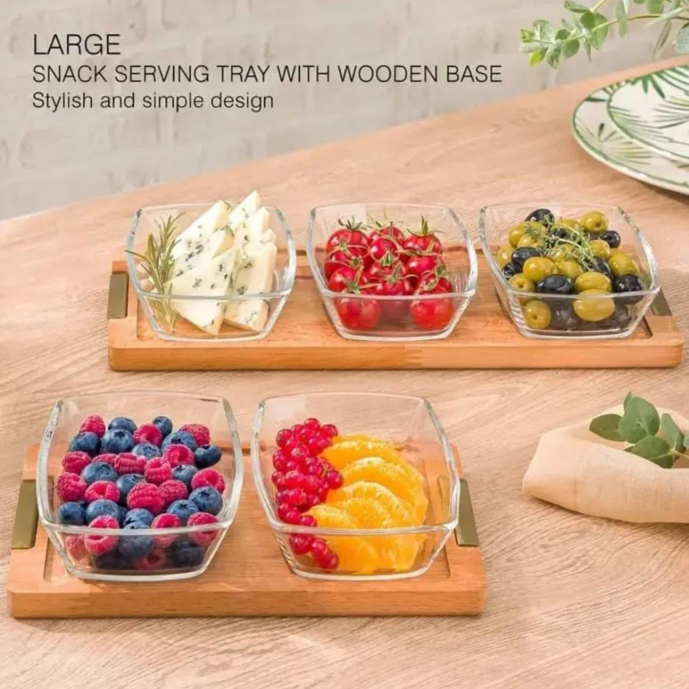 Elegant snack and serving set with clear glass trays and a premium wooden base