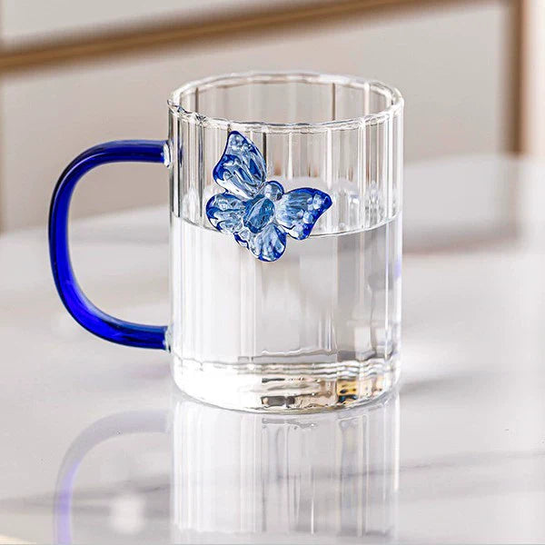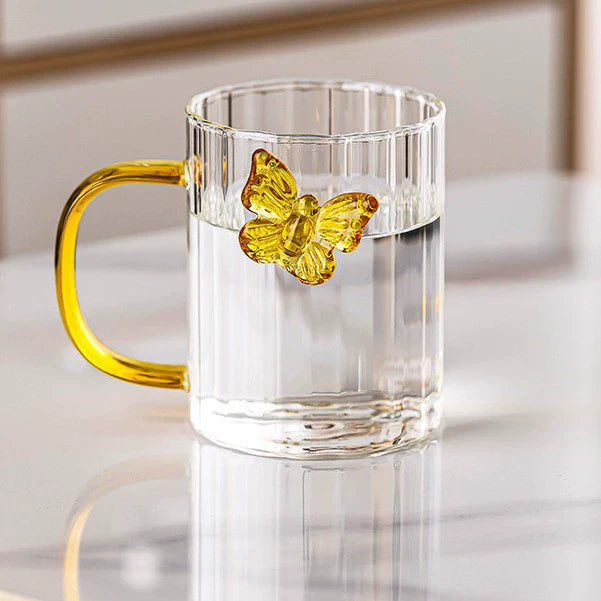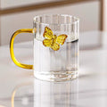Bring elegance to your daily drinkware with this High Borosilicate 3D Butterfly Striped Glass Mug. Crafted from heat-resistant borosilicate glass, it features a delicate butterfly design, stylish stripes, and a beautifully colored handle — making every sip visually delightful.
